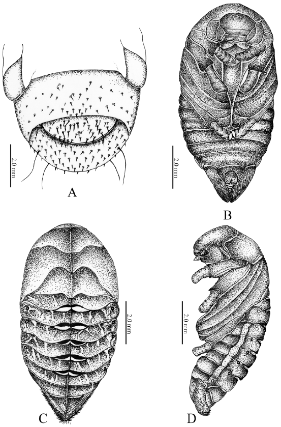 Figura 5 Platycoelia puncticollis. A, Último segmento abdominal-ráster (vista ventral); B, pupa hembra (vista ventral); C, pupa hembra (vista dorsal); D, pupa hembra (vista lateral).