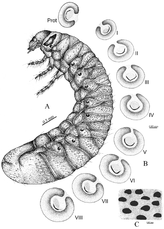 Figura 6 Platycoelia puncticollis. A, Larva de tercer estadio (vista lateral); B, espiráculos, protorácico y abdominales (vista lateral); C, orificios espiraculares.