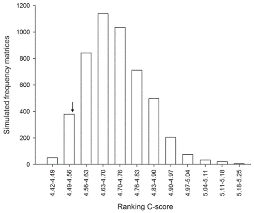 Figure 2 Co-occurrence patterns of the ants species sampled in a regenerating cerrado vegetation area of Brazil. The histogram shows the class frequency of simulated C-Score using the fixed-fixed model. The arrow indicates where the observed C-scores coincided with the frequency class of the C-scores of the 5,000 simulated matrices. The minimum and maximum values of the indices calculated for 5,000 randomized matrices were 4.42 and 5.25, while the observed C-score index was 4.54. The p- value was 0.0472 showing that observed index is outside of the 95% limit of the frequency distribution of randomized matrices, indicating ant species are not randomly distributed in the landscape.