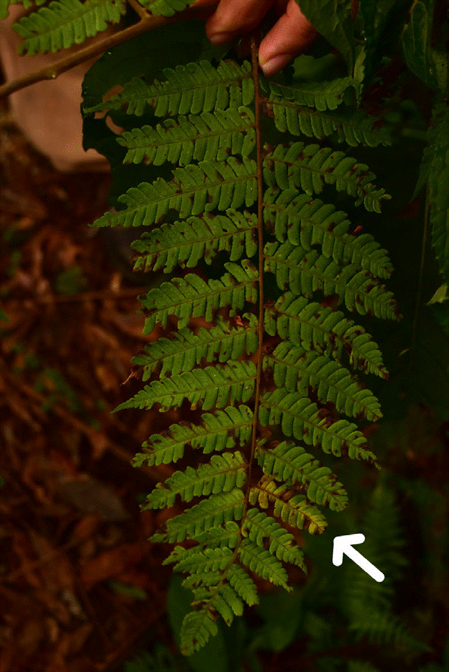 Figure 2 Fronds of Alsophila salvinii showing disease symptoms such as the presence of dark spots and blights, indicated by the arrow.