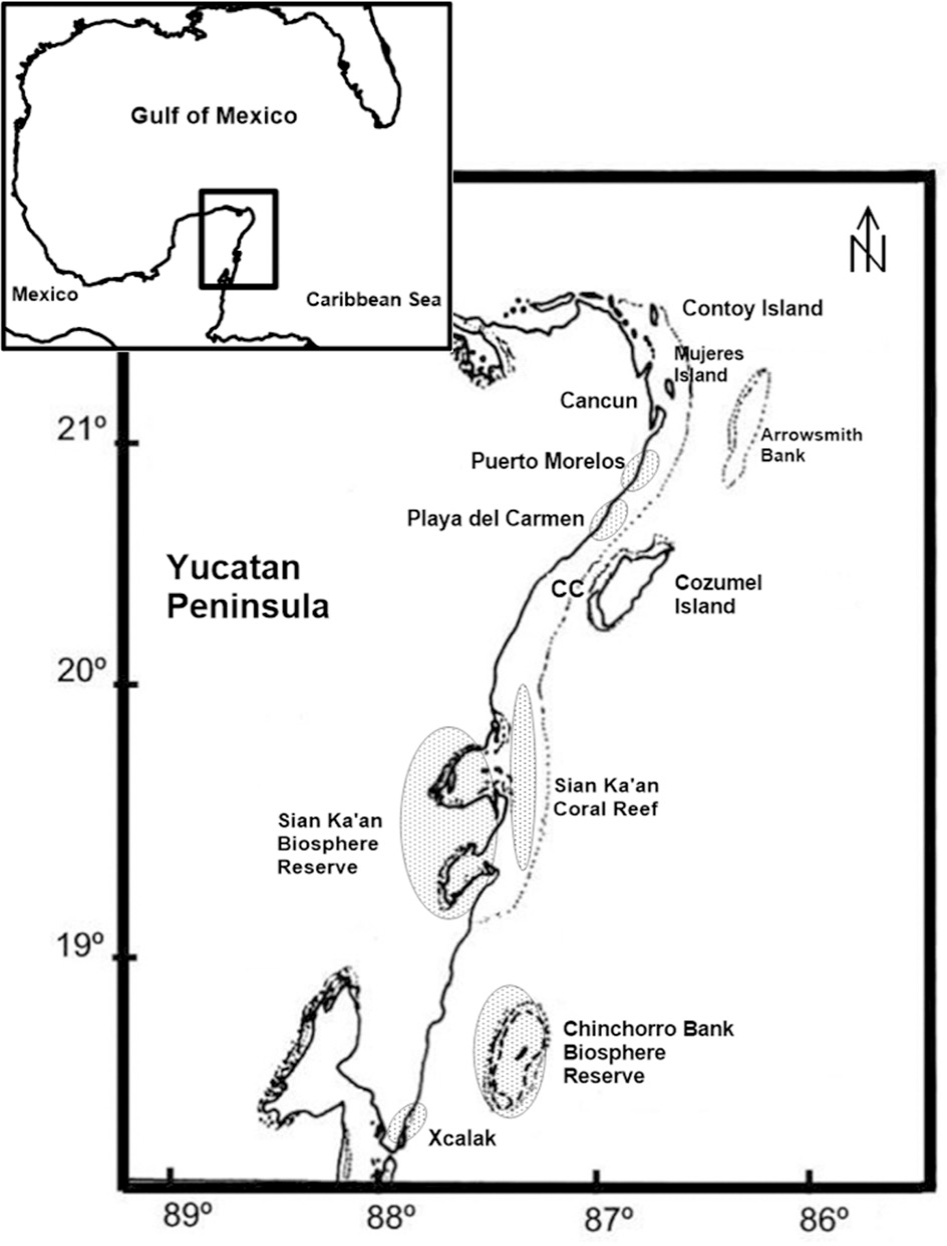 Figure 1 Map showing the Protect Marine Areas throughout the Mexican Caribbean Sea (shadow ellipses); CC, Cozumel Channel.