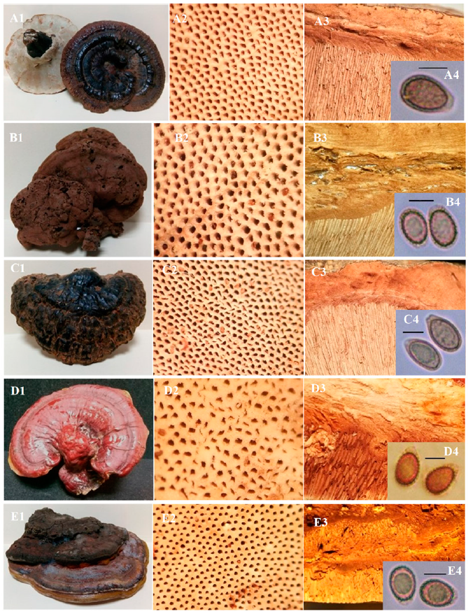 Figura 4 Ganoderma sichuanense: A1) basidioma, A2) poros, A3) contexto, A4) espora. Ganoderma stipitatum: B1) basidioma, B2) poros, B3) contexto, B4) espora. Ganoderma subresinosum: C1) basidioma, C2) poros, C3) contexto, C4) espora. Ganoderma tsugae: D1) basidioma, D2) poros, D3) contexto, D4) espora. Ganoderma zonatum: E1) basidioma, E2) poros, E3) contexto, E4) espora. Escala = 5 μm.
