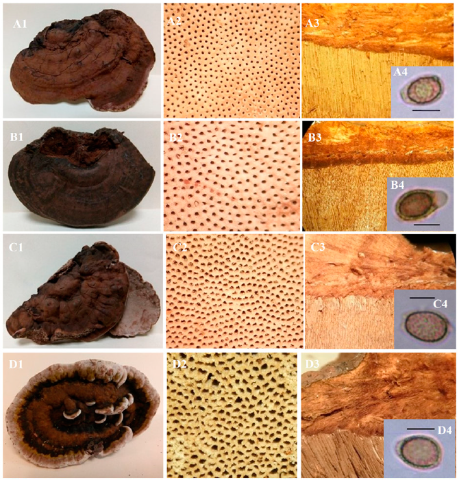 Figura 5 Ganoderma applanatum: A1) basidioma, A2) poros, A3) contexto, A4) espora. Ganoderma australe: B1) basidioma, B2) poros, B3) contexto, B4) espora. Ganoderma lipsiense: C1) basidioma, C2) poros, C3) contexto, C4) espora. Ganoderma philippii: D1) basidioma, D2) poros, D3) contexto, D4) espora. Escala = 5 μm.