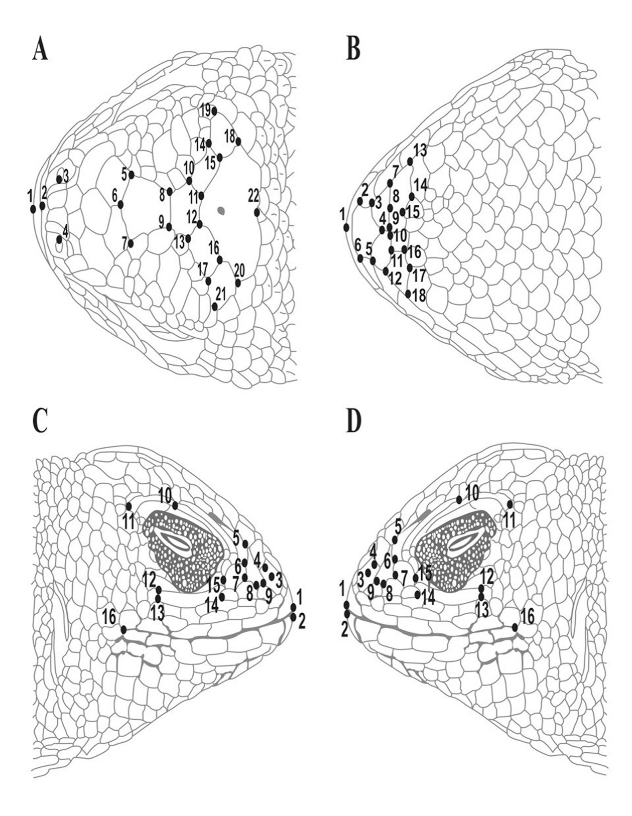 Figura 2 Marcas anatómicas bidimensionales registradas en las escamas cefálicas de S. aeneus y S. bicanthalis. A) Dorsal (p = 26), B) ventral (p = 18), C) lateral derecho (p = 16) y D) lateral izquierdo (p = 16). p = Número de marcas anatómicas usadas en cada vista. La configuración de coordenadas es homóloga en ambas especies (esquema modificado de Smith, 1939).