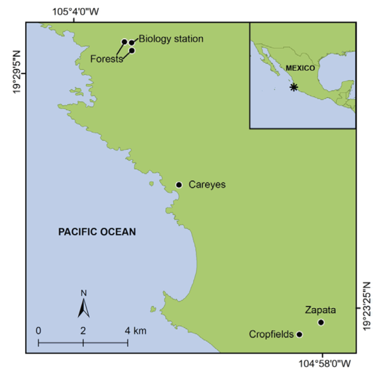 We conducted our study in a landscape between the Chamela-Cuixmala Biosphere Reserve (19°29’57.5” N, 105°02’41.6” W) and the town Emiliano Zapata (19°23’16.6” N, 104°57’50.1” W) in the Municipality La Huerta (population: 23,258; INEGI, 2020) on the Pacific coast of Jalisco, Mexico (Fig. 1). Historically, native vegetation cover in the region consisted primarily of tropical dry forest, which consists of deciduous forest with a mean canopy height of 12 m, a dense understory (Rzedowski, 2006), and strong phenological changes due to highly seasonal rainfall in the region (Durán et al., 2002). Other forest types exist in areas with more regular water availability, including semi-deciduous (mean canopy height of 20 m) and mangrove forests (Durán et al., 2002). After a period of increased human occupation and agricultural expansion from 1950-1970, large cover of tropical dry forest and other native forest types in lower elevation zones were converted to small towns and agricultural lands, linked by paved and unpaved roads, creating a landscape mosaic of native and non-native vegetation types (Maass et al., 2005).