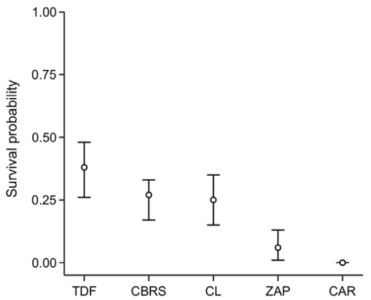 Figure 2 Survival probability with 95% confidence intervals from the Known Fate analysis in MARK of the artificial nests in the conserved tropical dry forest (TDF in the figure), Chamela Biological Research Station (CBRS), cropland (CL), the town of Careyes (CAR), and the town of Zapata (ZAP).