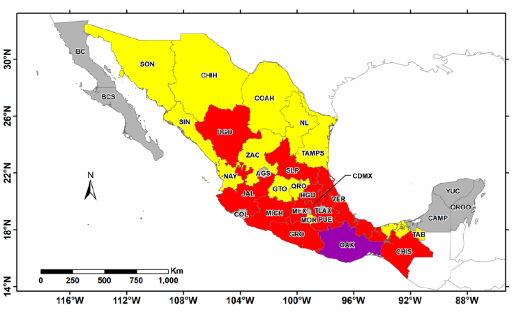 Figure 1 Species richness by state represented by quartiles (see Table 1 for raw values). Gray = first quartile (Q1 = 2,726.5 species), yellow = second quartile (Q2 = 4,335.5), red = third quartile (Q3 = 5,680 species), and purple = fourth quartile (Q4 = 10,534 species). AGS = Aguascalientes, BC = Baja California, BCS = Baja California Sur, CAMP = Campeche, COAH = Coahuila, COL = Colima, CHIS = Chiapas, CHIH = Chihuahua, CDMX = Mexico City, DGO = Durango, GTO = Guanajuato, GRO = Guerrero, HGO = Hidalgo, JAL = Jalisco, MEX = Estado de México, MICH = Michoacán, MOR = Morelos, NAY = Nayarit, NL = Nuevo León, OAX = Oaxaca, PUE = Puebla, QRO = Querétaro, QROO = Quintana Roo, SLP = San Luis Potosí, SIN = Sinaloa, SON = Sonora, TAB = Tabasco, TAMPS = Tamaulipas, TLAX = Tlaxcala, VER = Veracruz, YUC = Yucatán, ZAC = Zacatecas. Map by E. Ortiz.
