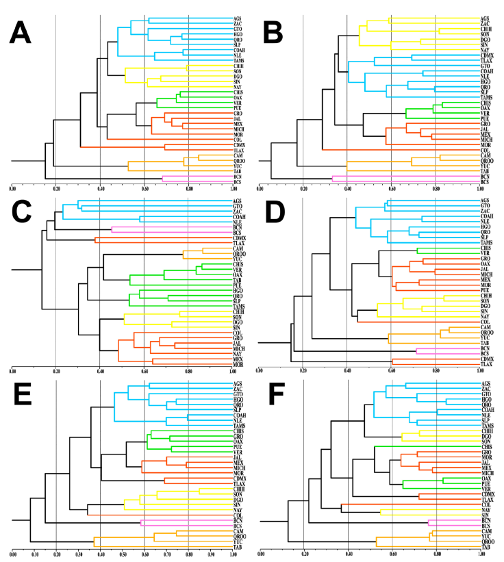 Figure 2 Floristic similarities among Mexican states. A, Total floristic richness; B, Humid Mountain Forest (HMF); C, Humid Tropical Forest (HTF); D, Seasonally Dry Tropical Forest (STF); E, Temperate Forest (TEM); F, Xerophytic Scrub (XER).