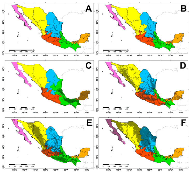 Figure 3 Geographical arrangement of the floristic groups recovered in the cluster analyses (Fig. 2) based on overall floristic richness and richness by biome. A, Total floristic richness; B, Humid Mountain Forest; C, Humid Tropical Forest; D, Seasonally Dry Tropical Forest; E, Temperate Forest; F, Xerophilous Scrub. The gray shading in figures B-F shows the distribution of the corresponding biome.
