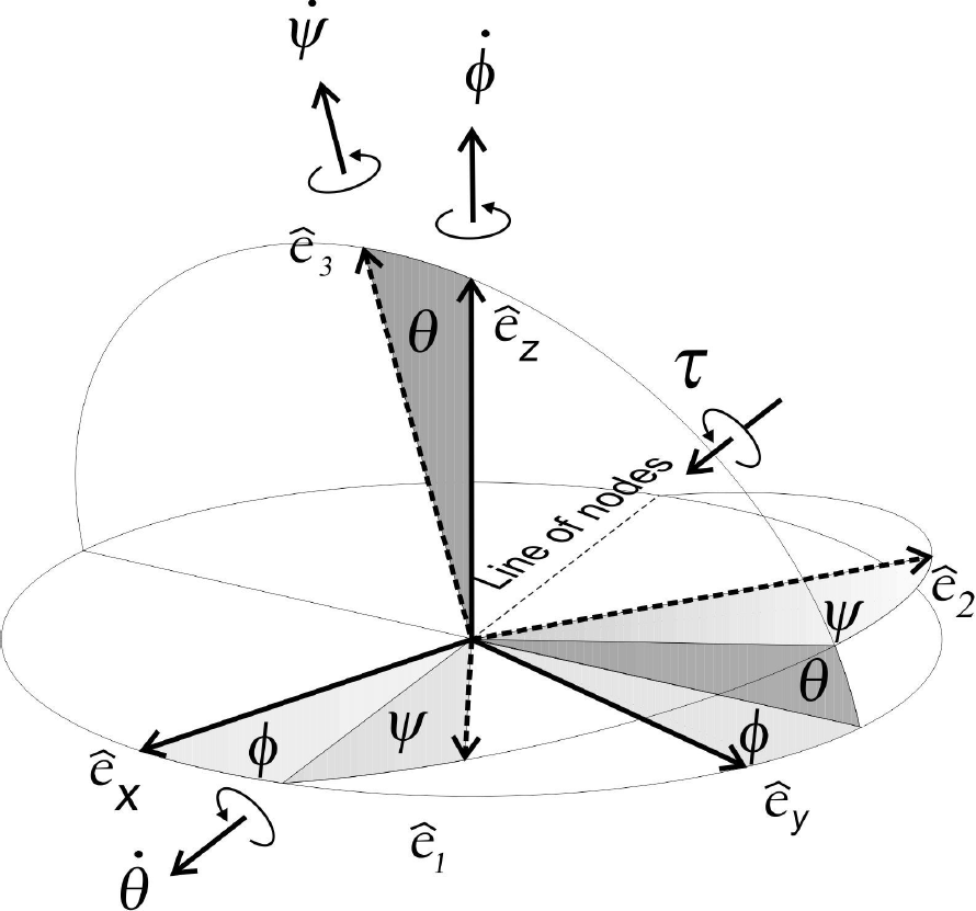 Gyroscope’s orientation is fully described by three Eulerian angles corresponding to the angles that relate the main axis of a gyroscope with the coordinate axis on a steady state system {e^x,e^y,e^z}; where by convention, z axis represents vertical direction. Each of these angles can be associated to each different movement on a gyroscope. The zenith angle θ corresponds to the angular separation between the symmetry axis e^3 and the vertical; and it determines the nutation movement. The azimuthal angle ϕ, formed between the x axis and the nodes line (intersection between horizontal plane and that other, perpendicular to the symmetry axis), it determines the precession. Finally, ψ angle which accounts for the body spinning around of symmetry axis, and determines the rotational movement. Figure 1 is a graphic representation of Euler’s angles and the angular velocity associated to them.