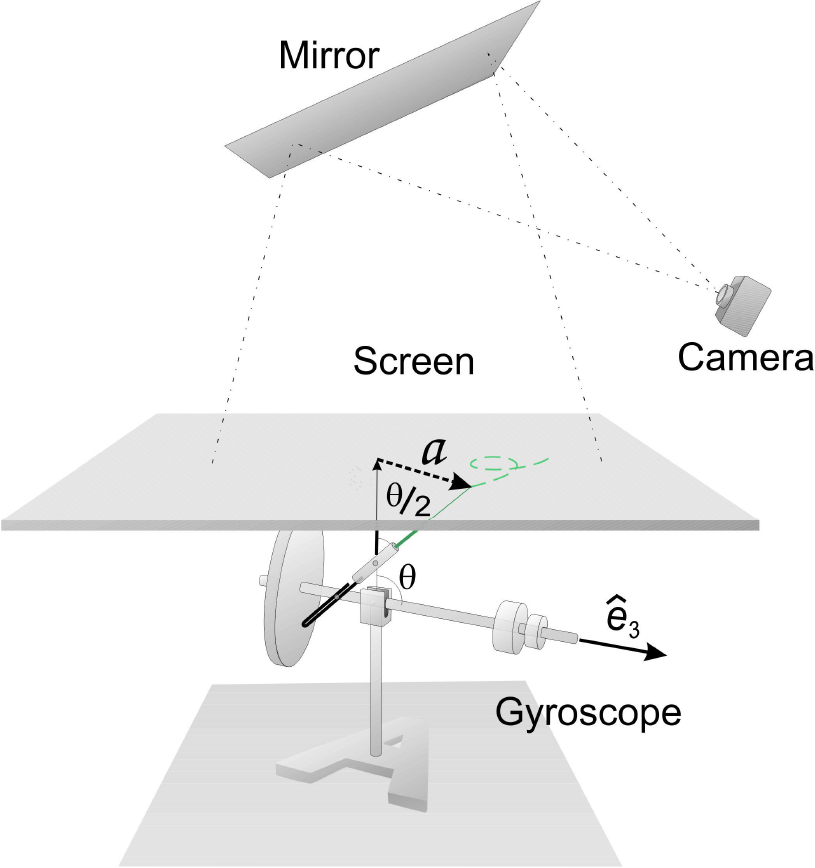 With an experimental set up we looked for a corroboration of the gyroscope solution, Eq. (17), with its corresponding parameter values, fits in an exactly way to an experimental situation. For this experience was used a Pasco ME8960 gyroscope, it consist of a disk of 1.755 ± 0.001 kg mass with a radius of 12.7 ± 0.1 cm and a thickness of 2.0 ± 0.1 cm, which can spin around an axis with little friction, at the same time this axis may be orientated in any azimuthal direction but inside a range of 30° to 140° respect to the zenith. The orientable axis has a fixed point at 12.7 ± 0.1 cm from the disk, which is pivoted at 30.7 ± 0.1 cm from the floor over a vertical bar. This bar is nailed in the center of an A-shaped base of molten iron, and it can rotates around its own axis. At the opposite end of orientable axis, opposite to the disk, there is a counterweight that works to vary the position of the center of mass.