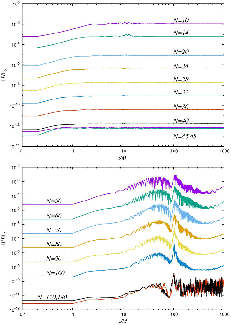 Figure 1 L2 norm of the Hamiltonian constraint as a function of time using the PS method for a different number of collocation points N. On the top we show the results for the spatial domain r ∈ [1.9,11.9]M and on the bottom we show the results for r ∈ [1.9,101.9]M.