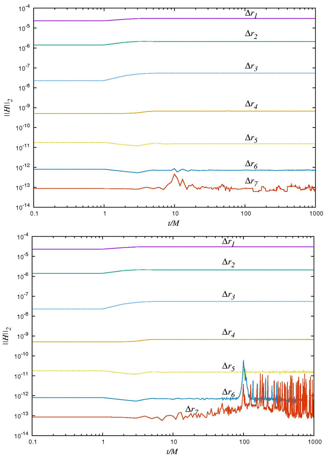 Figure 2 L2 norm of the Hamiltonian constraint as a function of time using FD for seven different resolutions: ∆r1,...,∆r7. The same values of ∆r are used for both spatial domains r ∈ [1.9,11.9]M (top panel) and r ∈ [1.9,101.9]M (bottom panel).