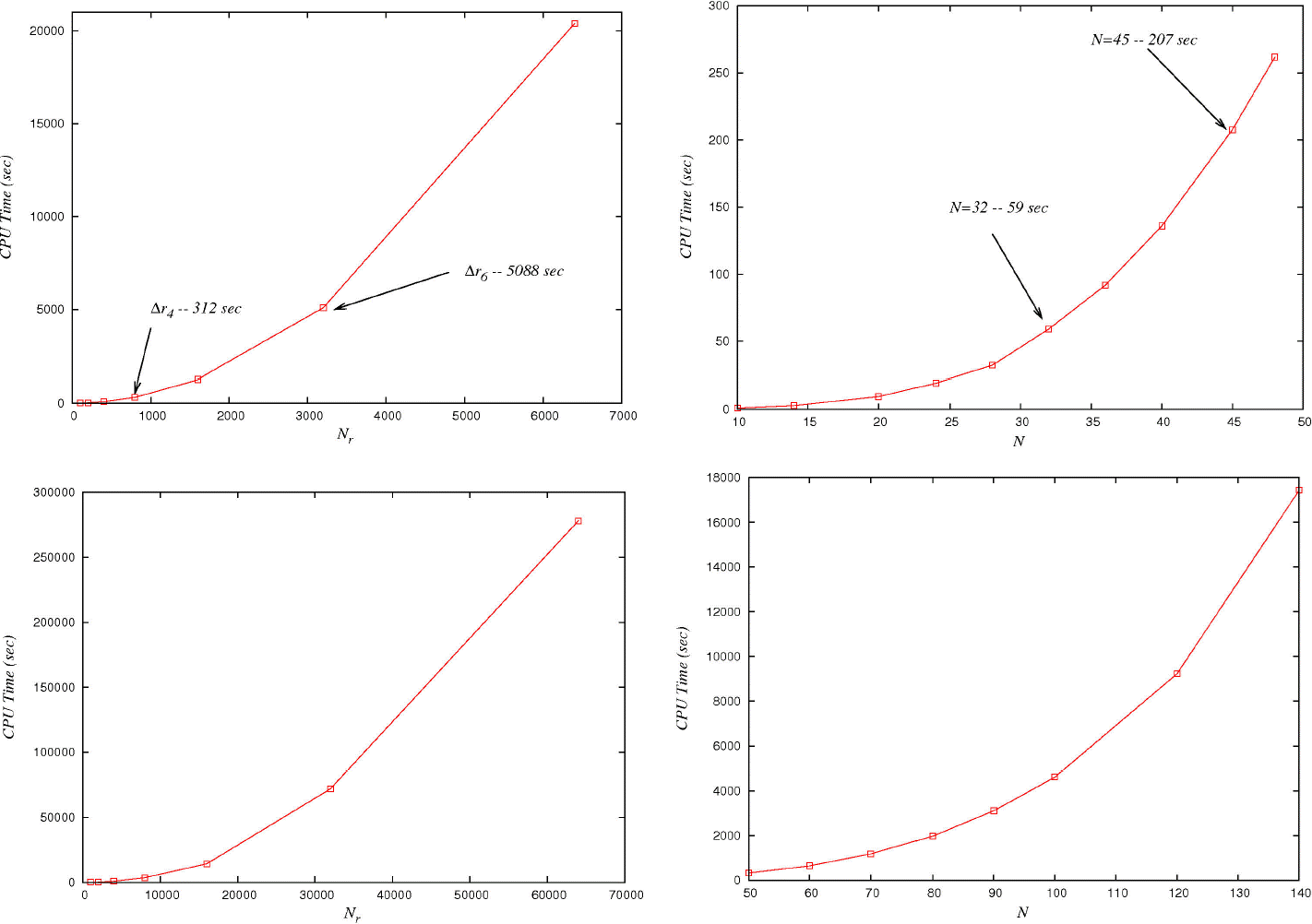Figure 3 CPU time using the two numerical methods for a run on the domain r ∈ [1.9,11.9]M (top) and [1.9,101.9]M (bottom) during a time t ∈ [0,1000]M. For the two methods we use the same resolutions used for the accuracy. We can appreciate the different scaling of the two methods. The plots on the left correspond to FD and the plots on the right correspond to PS.