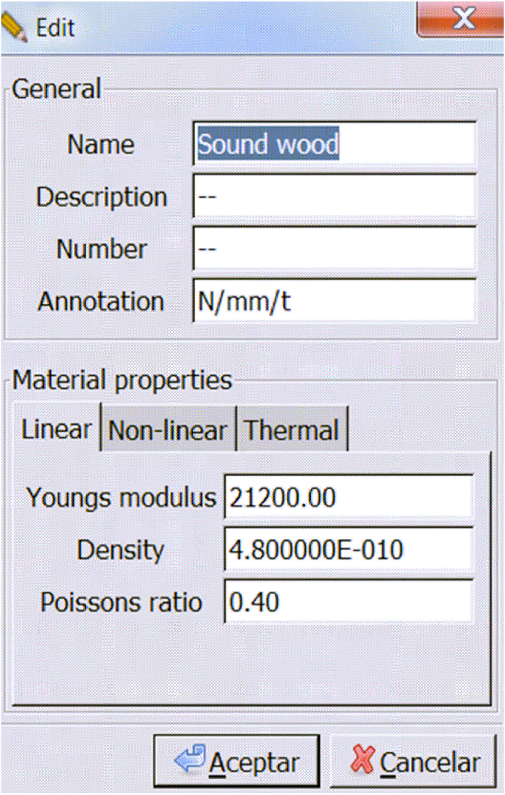 The material properties are defined through the Pre-processor tab, where a Material database available is selected. The unit system can be modified by the user, see Fig. 3. In order to have compatibility with the units system of materials already included in AuroraZ88, viz. mm/t/N units (see its user-guide); i.e. millimeter/ton/newton. It proceeds to define the density measured experimentally, 4.8e-10 t/mm3. Later on, enter a Young’s modulus of 21200 N/mm2, and a Poisson’s ratio = 0.40, which values were estimated from the expected range for the spruce 25.