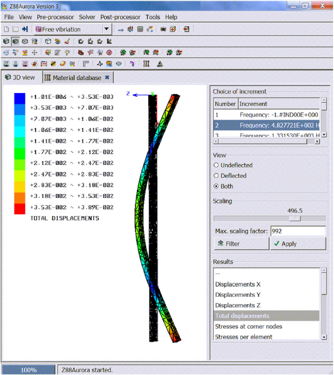 Finally, at the post-processor step, display the menu on the right side of the program interface, and select visualize the solution of the eigenvalues of the second vibration mode. Specify the values of displacement to display in the Z direction and the beam geometry without deformation, in range of red-blue and black lines, respectively.