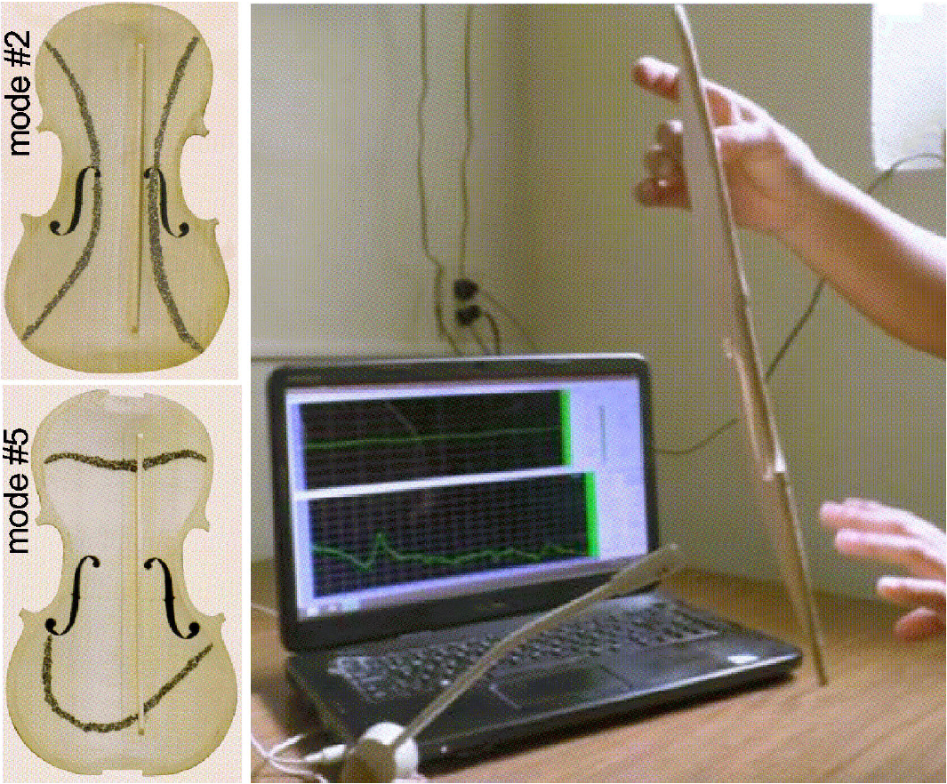 Figure 7. Chladni patterns of the second and fifth free modes of a violin top plate, and experiment to measure the resonant frequencies of a free violin top plate; as it was reported in a thesis of violin making 29.