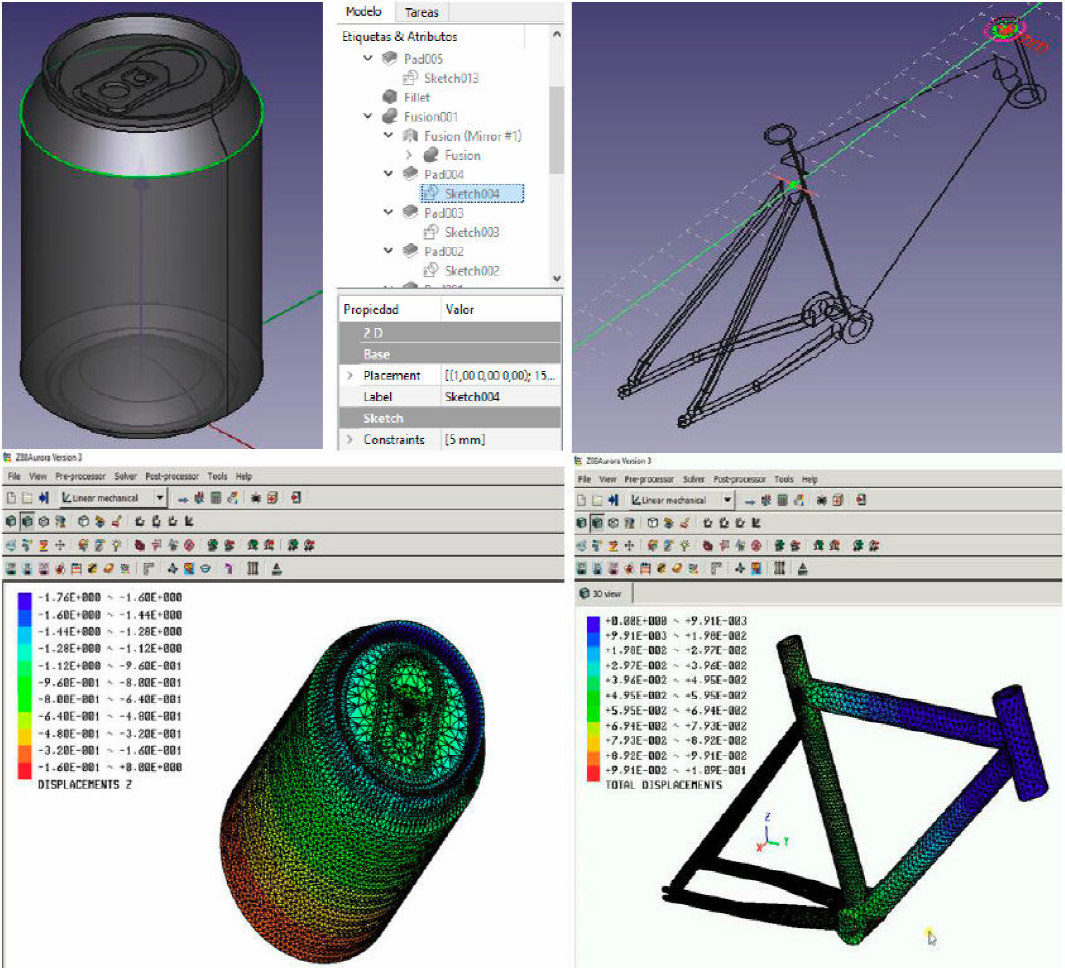 On the projects of this course, the construction and deformation of two structures of aluminum were made: a can and a bicycle frame. Both structures were subjected to a combination of compression and tensions stresses, within the elastic regime, and the total-displacements caused were analyzed. The corresponding FreeCAD models and their FEM results calculated in AuroraZ88 are shown in Fig. 8.