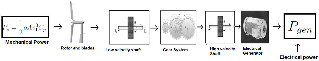 A theoretical framework is considered in this section: on the first subsection, the wind power theoretical development is presented. On the second subsection, the elements for the energy conversion are shown. Finally, the link between the wind linear speed v and the angular speed ω is explained, and the relation between the input power P and the output Pgen (electrical power) is presented.