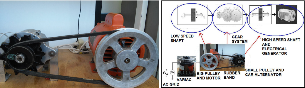 The low velocity shaft rotation was emulated with an alternate current (AC) motor. The motor angular speed can be controlled with a variable transformer (VARIAC) connected between the motor and the AC grid. A big pulley is attached to this motor and these 3 parts (AC motor, VARIAC and big pulley) emmulate the behaviour of the low speed shaft. Then a rubber band connects the large pulley with another small pulley emulating the gear system. The ratio between the pulleys is 1:4. Finally, that small pulley is attached to a simple car alternator changing mechanical power into electrical power. Basically, this car alternator is a synchronous generator and needs a battery or DC source to operate. These parts are shown on Fig. 3 and a summary table with the characteristics of those parts is shown on Table I.