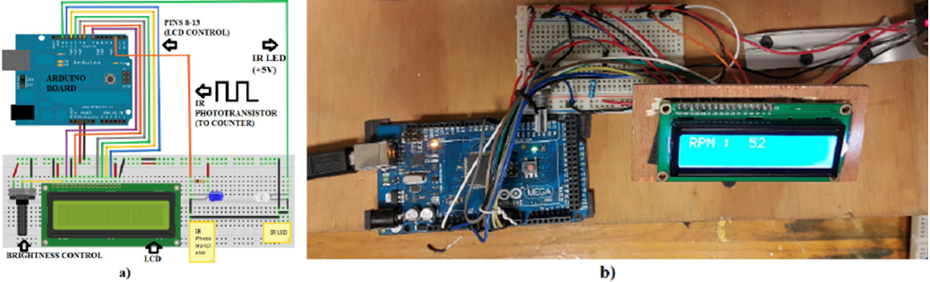 Figure 4. a) Digital tachometer schematic b) Real tachometer.