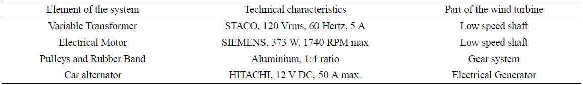 Table I. Comparative table of elements of the experimental system and a wind turbine.
