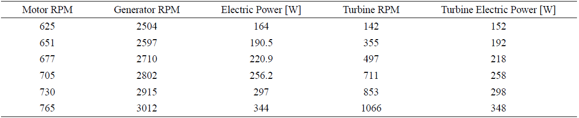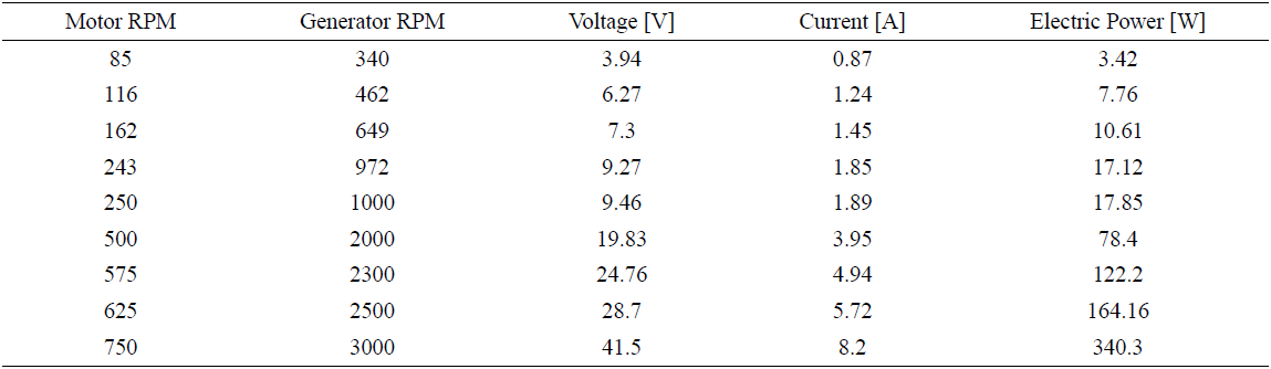 As expected, not significantly electric power could be obtained from low angular speeds (below 1000 RPM); but from 1000 RPM, electric power increases exponentially.