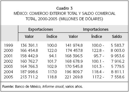 Es importante aclarar que en el 2005 el 45.5 por ciento (Banco de México, 2006:160) de las exportaciones de México se originaron en el sector de las maquiladoras, donde la producción consiste principalmente en el simple ensamblado y reexportación de componentes importados; en efecto, la actividad exportadora se asocia con muy poco valor agregado y mínima transferencia tecnológica. En consecuencia, México ha quedado altamente expuesto a la competencia externa. Otro aspecto importante del auge del comercio exterior mexicano es el no haber tenido una influencia positiva que se reflejara en elevadas tasas de crecimiento de la productividad laboral y en las remuneraciones reales, es decir, porque en la primera su tasa de crecimiento promedio entre 2000 y 2005 fue de 3.8 y en la segunda de 0.08 (Banco de México, 2005: 119).