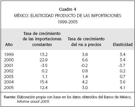 Contrariamente a las transformaciones tan fuertes y rápidas del sector exportador de la economía, no se logró superar el recurrente problema de la elasticidad producto de las importaciones, el cual resulta ser muy grave; ello ha anulado las posibilidades de un crecimiento sostenido en virtud del desequilibrio externo que periódicamente se genera. De este modo, la fuente dinámica de crecimiento por la expansión de la demanda escapa al exterior en forma de más importaciones, en lugar de servir de mercado para las unidades productivas establecidas en el país. Si bien es cierto que hay una mejoría en la balanza de cuenta corriente, al disminuir el déficit, que pasó de 18 628.3 millones de dólares en 2000 a 5708.3 millones de dólares en 2005 (véase cuadro 2) esta situación obedeció en parte importante a los ingresos que recibió el país por el envío de remesas totales familiares (véase cuadro 3) y no es resultado del crecimiento de las exportaciones manufactureras mexicanas, porque el saldo de la balanza comercial continúa siendo negativo. Conjuntamente, se registra un incremento en la elasticidad producto de las importaciones (véase cuadro 4).
