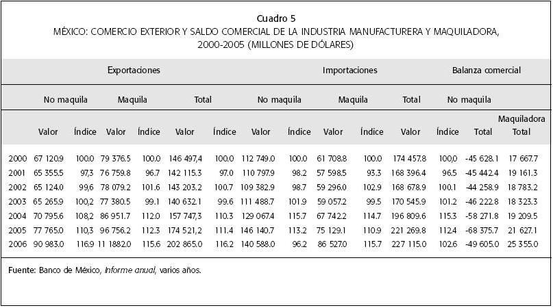 La expansión de las exportaciones totales del sector manufacturero y maquilador desde el año 2000 hasta 2006 ha tenido un crecimiento de 38.47 por ciento y en cambio, las importaciones totales para este mismo periodo han sido de 30.18 por ciento; sin embargo, es importante mencionar que la balanza comercial del sector maquilador es superavitaria, pero la del conjunto de la manufactura y la maquiladora se mantiene en un déficit comercial crónico (véase el cuadro 5).