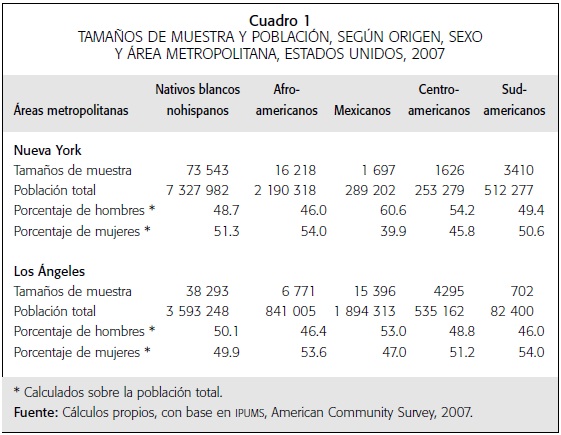 El área metropolitana de Nueva York tiene 17 660 358 habitantes, de los cuales el 15 por ciento procede de América Latina y el Caribe. Los Ángeles cuenta con 12 876 125 habitantes, de los cuales el 20.6 por ciento son inmigrantes procedentes de la región. Entre éstos los mexicanos constituyen la gran mayoría (el 71.6 por ciento). En el cuadro 1 se presentan los tamaños de la muestra, la población total y la distribución porcentual de la misma de acuerdo con el sexo en las áreas metropolitanas de Nueva York y Los Ángeles. En el área metropolitana de Nueva York, los hombres mexicanos y nativos blancos no hispanos constituyen mayoría (el 53 y el 50.1 por ciento, respectivamente). En Los Ángeles, los hombres mexicanos y los centroamericanos representan el 60.6 y el 54.2 por ciento, respectivamente. La mayor concentración de hombres de estos orígenes se explica por el carácter mismo de la migración que va desde México y Centroamérica. Es decir, se trata de migración predominantemente masculina, que tradicionalmente se ha desplazado por motivos laborales (Durand y Massey, 2003).5