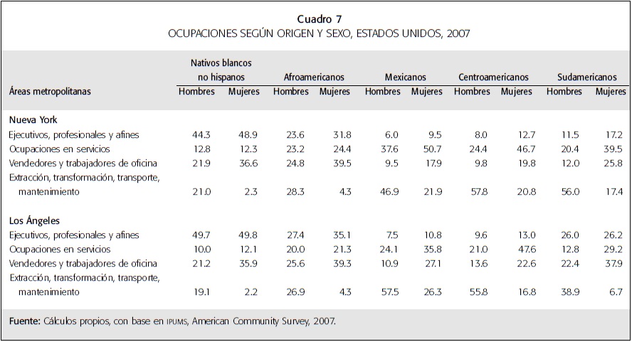 Para algunos inmigrantes, las posibilidades de insertarse en una ocupación calificada son menores en Nueva York. Ello puede deberse a que a este lugar llegan inmigrantes con más bajos perfiles ocupacionales que los que ingresan al área metropolitana de Los Ángeles cuando menos en el caso de los sudamericanos. La estructura productiva del área tiene mucho que ver, pues en Nueva York hay una enorme expansión de los servicios que, como es sabido, generan empleos que requieren alta especialización, pero también muchos empleos de baja calificación. En Los Ángeles, si bien hay fuerte presencia de servicios, el desarrollo de la industria de alta tecnología ha generado empleos de ambas características, pero favorece la mayor inserción de trabajadores con mayor formación académica y tecnológica.