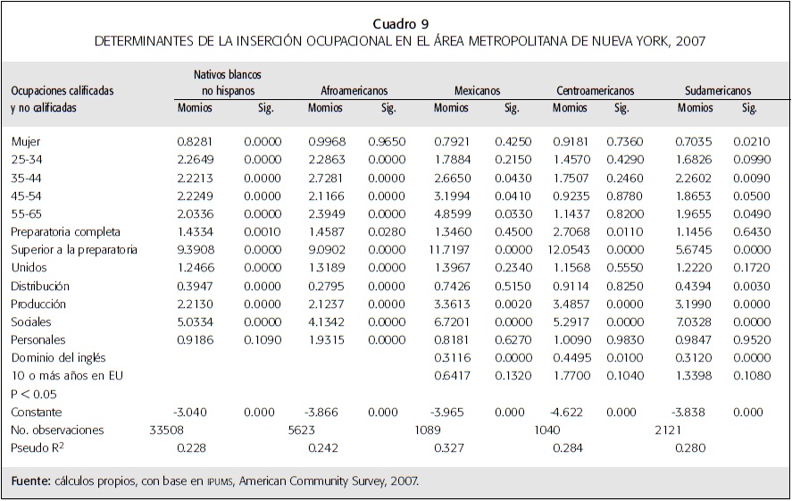 Para todos los trabajadores, la escolaridad determina su inserción en ocupaciones calificadas. Pero como se observó, su peso varía de acuerdo con el lugar de origen de los mismos y al área metropolitana. Entre los inmigrantes, el nivel de inglés es trascendental en la inserción en este tipo de ocupaciones; en Nueva York, el tiempo de permanencia en el país no hace una diferencia significativa entre el hecho de insertarse o no, mientras que en el área metropolitana de Los Ángeles esta permanencia tiene un impacto significativo en la inserción de los centroamericanos y los sudamericanos. En ambas áreas metropolitanas el riesgo de insertarse en una ocupación calificada es mayor cuando se trata de la rama de servicios sociales en relación con las actividades de extracción y transformación, pero cabe destacar que el riesgo aumenta cuando se trata del área metropolitana de Nueva York. Además, hay diferencias significativas por lugar de origen.