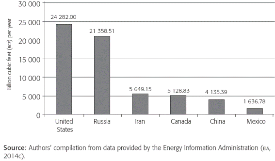 Being on the top of global economic growth translates into consuming large quantities of energy resources. "We consume about 25 percent of the world's oil. We only have 2 percent of the reserves. So the only way for America's energy supply to be truly secure is by permanently reducing our dependence on oil" (Obama, 2011). The United States has approximately 2.3 percent of the world population and consumes almost 20 percent of the world´s energy (EIA, 2013). Its consumption is more than that of the UK, Germany, China, Iran, Japan, and Canada combined (Enerdata, 2014b). By 2035, shale gas production will rise to 385.1 million cubic meters, representing nearly half of all U.S. natural gas production. Just 28.3 billion cubic meters of natural gas is enough to heat 15 million homes for one year, generate 100 billion kilowatt hours of electricity, or fuel 12 million natural-gas-fired vehicles for one year (U.S. Department of Energy, 2012).