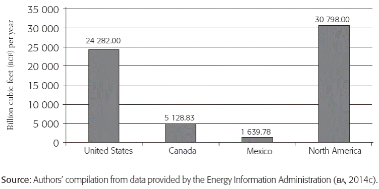 Canada is one of the world's five largest energy producers and one of the top natural gas producers, with 5,128.83 billion cubic feet (BCF) in 2013, and the main source of U.S. energy imports. 7 In 2011, Canada's energy exports were valued at US$120 billion, with 90 percent going to the U.S. in natural gas exports, representing 13 percent of U.S. consumption (Government of Canada, 2013). In 1980, technological development in horizontal drilling became commercially available in Canada, increasing its productive capacity not only in shale but also in conventional resources such as natural gas and oil (Government of Canada, 2013). The bilateral relationship between Canada and the United States has changed since U.S. shale basins have now become economically recoverable, transforming the North American region from a consumption giant to a major production area. Table 5 shows a total combined production of 30 798 billion cubic feet (BCF) in 2012. The economic partnership among these nations has the power to boost the regional economy (McCallum, 2011).
