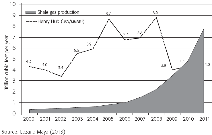 The gas industry's competitiveness extends to prices, which are deregulated and encourage a more effective dissemination of information amid producers and clients (Lozano Maya, 2013). Since 1980 when policies were applied to deregulate gas prices and through the ultimate creation of the Henry Hub (see Graph 5) as a reference for spot and future transactions, producers have been extremely responsive to gas prices. Consequently, shale gas production flourished in reaction to the steady growth in gas prices from 2000 despite the fall of prices starting in 2009. 10