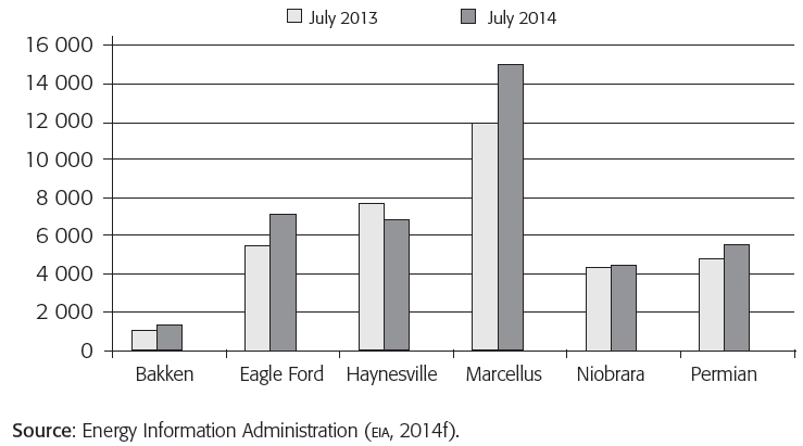 The Marcellus Play is the largest producing shale gas basin in the United States (see Figure 3 and Graph 7), exceeding 15 billion cubic feet per day (BCF/d) in July 2014, thus accounting for 40 percent of U.S. production (EIA, 2014e). It has developed infrastructure and, therefore, the capacity to sustain well drilling and pipeline network construction beyond those built in recent years (EIA, 2014e). This will provide natural gas to highly populated areas in the United States such as New Jersey, New York, and New England.