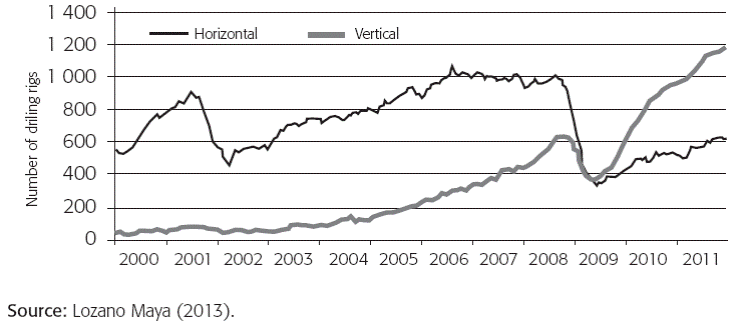 Due to the complexity, uncertainty, and investment involved in shale gas production, cost reduction is vital to increasing the supply. While the cost of a vertical well is approximately US$800 000 the amount increases to US$2.5 million or more for a horizontal well (Lozano Maya, 2013). In this case, unlike other markets where monopolies often guide production or are responsible for it, the U.S. oil extraction industry is owned by a large number of producers, predominantly medium-sized and small.