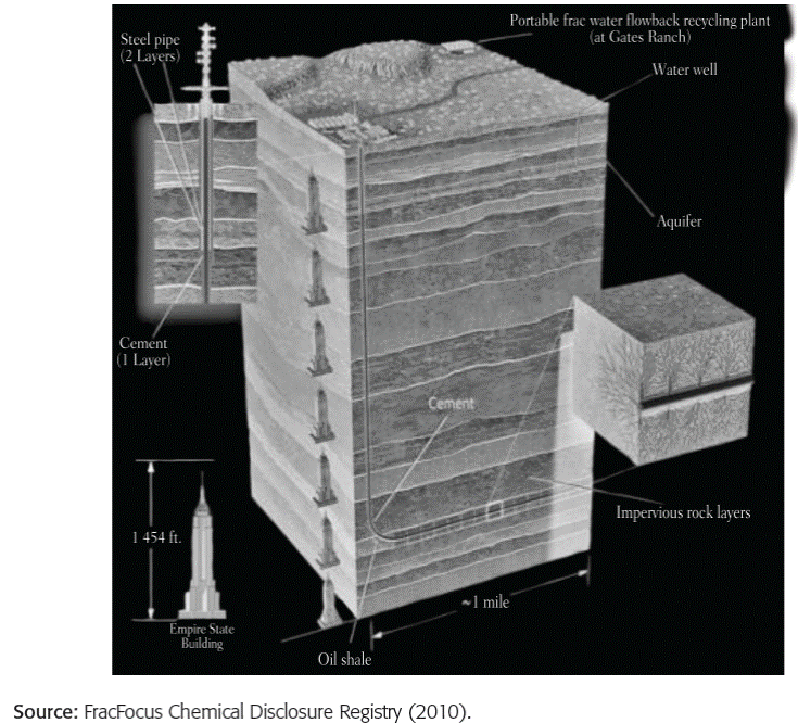 Another environmental impact associated with the development of shale gas is related to water; first, the possibility of the use, treatment, and recycling of the water, or "flow-back" water, containing among other products the fluids injected into the well to fracture the rock. The water is mixed with approximately 70 chemicals, some considered toxic, mutagenic, and carcinogenic (Schmidt, 2011: 350). According to the U.S. Environmental Protection Agency (EPA, 2014), only 15 percent to 80 percent of the flow-back water is recovered, creating additional concerns. Secondly, the process requires considerable volumes of water and varies depending on the geological characteristics of the deposit. It is estimated that 35 000 wells are fractured in the United States annually, representing approximately the amount of water used by some five million people (Schmidt, 2011: 352). There is also environmental concern about the contamination of groundwater, or aquifers, in the extraction process as methane is liberated from the shale formations through induced fracturing (see Figure 5).