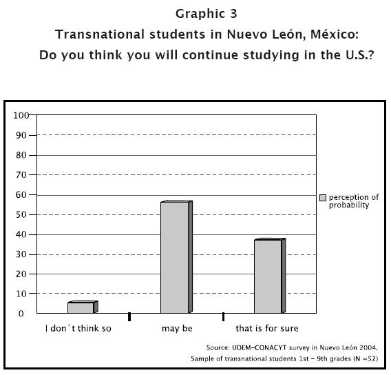 When, on the longer survey, we asked sixth and ninth grade students with U.S. school experience if they thought it was probable that they would attend U.S. schools again in the future, 5.8% responded that it was unlikely; 55.8% considered it probable; while 38.5% responded that they were sure they would attend U.S. schools again. (See Graphic 3). In short, Graphs 2 and 3 show that students are moving between school systems in the two countries, in Mexico at the moment of our survey, but not necessarily permanently (back) in Mexico.