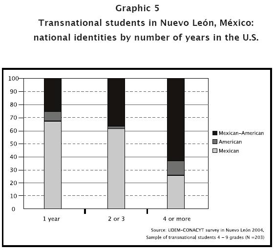 In a portion of our study with echoes of Keefe and Padilla's (1987) and Oboler's (1995) studies of how U.S. Latinos ethnically identified, we asked our transnational student subsample how they identified in terms of nationality. A little more than half identified themselves as "mexicanos"; 37% self-identified as "mexico-americanos"; and only 6% identified themselves as "americanos." Country of birth, number of years living in the United States, and the associated preference for English or Spanish were all correlated in expectable ways with the nationalities with which transnational students identified. As one can observe in Graphic 5, the identity "mexico-americano" was more likely to be preferred by those who had spent more years in the United States. Self-identification as "americano" was not correlated with time in the United States, rather it was directly associated with place of birth. Practically all who identified themselves as "americano" had been born in the United States; legally, they were American citizens. But, we also encountered a few who identified themselves as "americanos" who had been born in Mexico and some who had been born in the United States but who did not identify as "americano." Why the correlations are partial rather than complete is a topic that deserves more thorough investigation on a case-by-case basis to understand why children and adolescents self-identify with one country, the other, or both. It would also be worthwhile to investigate how this self-ascribed identity aligns with future orientation (in terms of desire to stay in Mexico or return to the United States, in terms of educational and career aspirations, and so on).