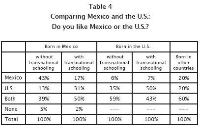 Examining the data a little more closely, we can confirm that from the perspective of the transnational students sample, schooling in Mexico has not been chaotic, frustrating or incoherent even though they have spent time in another system(s) that was not formally aligned with what they have encountered in Mexico. Our preliminary data suggest that most students develop the capacity to be comfortable and satisfied with both systems. Few seem to be trapped between the two systems (although our sampling method of administering surveys at school would not have counted any prospective student who had dropped out of the Mexican system even if they were still eligible to do so). Our data justify the term we have been using heretransnational studentbecause these seem to be students capable of negotiating two schooling universes, two languages, and two projects of nation states.