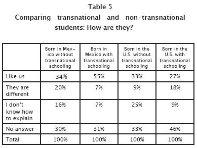 As a final topic, we share our data regarding how students in the different groups thought of each other. A third (34%) of the non-transnational students in Nuevo León thought the transnational students were just like them, while 20% thought that transnational students were different and 16% said they did not know how to explain. Among the group that perhaps had the greatest incentive to prove their "Mexicanness" (i.e., those born in Mexico but with U.S. school experience), fully 55% insisted that transnational students were just like non-transnational students, with only 7% disagreeing. However, because the percentage of "don't knows" and non-answers to this prompt was so high (see Table 5), it was difficult to draw more definite conclusions about this topic. Further study of this topic, perhaps using additional methods, seems warranted.
