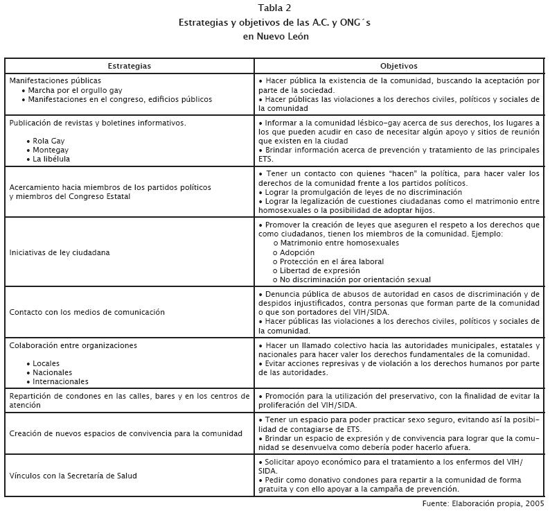 Las estrategias se encuentran dirigidas tanto al interior de la comunidad como al exterior de la misma. Hacia el interior, se busca que los homosexuales y lesbianas conozcan los derechos que tienen, como cualquier otro ciudadano, para no ser víctimas de la discriminación, del abuso de autoridad y de la violencia. Por ejemplo, organizaciones como Rola Cay, publican, mensualmente, 30 000 ejemplares que son distribuidos en toda la República, con el propósito de dar información hacia dentro de la comunidad, acerca del VIH/SIDA, el uso del condón, espacios donde pueden interactuar y sus derechos civiles. Hacia el exterior, lo que se busca es, por un lado, hacerse visibles para la sociedad mediante marchas, manifestaciones y denuncias en los medios de comunicación, con el fin de que sean aceptados como parte de ella, y al mismo tiempo se procura formar en la sociedad un ambiente de respeto a la diversidad. Una acción emblemática de este tipo es la realización anual de la Marcha por el Orgullo Cay, la cual se realizó por vez primera en el año 2000, en Monterrey.