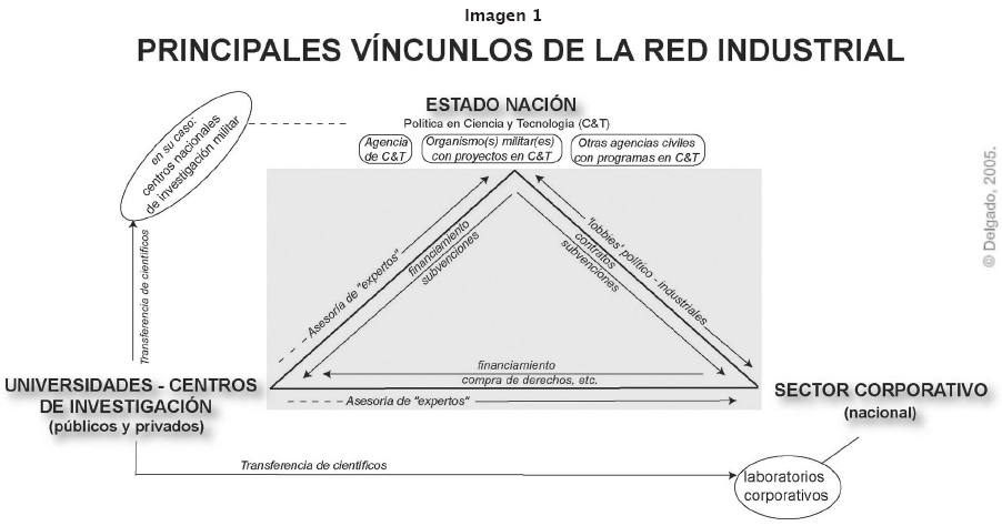 Lo que Eisenhower calificó como "el complejo militar industrial", yo lo denomino como red industrial para dar cuenta, al mismo tiempo, de la dimensión civil de tal "complejo". Así pues, la red industrial se refiere obligadamente al funcionamiento consolidado y en sinergia de todo el conjunto de las mencionadas relaciones sinérgicas entre el Estado nación, el sector corporativo y las universidades y centros de investigación públicos y privados (véase imagen 1).