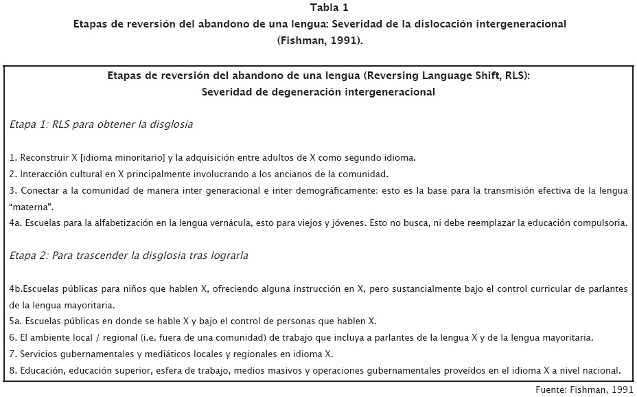 La tabla 1 presenta las distintas etapas propuestas por Joshua A. Fishman en su obra Reversing Language Shift (Revertir el abandono de una lengua, 1991). Estas etapas muestran el camino para revivir las lenguas minoritarias en peligro de extinción; las etapas toman en cuenta tanto la planificación del corpus como la del estatus. La primera etapa, compuesta de cuatro niveles distintos, es cuando se alcanza la disglosia, que se refiere a cuando los hablantes de una lengua marginada utilizan su propia lengua en contextos íntimos (con su familia, amigos o conocidos) pero usan alguna otra lengua en espacios públicos (Fishman, 1991).