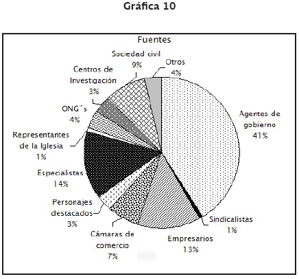 Por último, se presenta un análisis de las fuentes a las cuales recurre el periódico como una forma de evidenciar a "quiénes" y "en qué medida" el diario acude para la construcción de la agenda informativa. Cabe mencionar que, al igual que en la distribución de temas, la asignación del espacio dedicado a las fuentes es prácticamente igual para la submuestra de 1995 y la de 2005. Esto evidencia que el periódico tiene una agenda muy planificada, no sólo de los temas que trata sino también con respecto a las fuentes a las cuales acude para cubrirlos (véase gráfica 10).