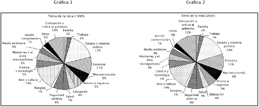 En primera instancia, se presenta un análisis de la distribución de los temas a los que se dedicó mayor espacio en la muestra de periódicos, comparando la muestra del año 1995 (gráfica 1) y del año 2005 (gráfica 2). Es notorio comprobar que, por lo menos en las secciones escogidas, la distribución de temas (en muestras aleatorias que difieren en diez años) presenta un comportamiento que permanece constante, demostrando una agenda muy planeada con respecto al espacio que se asigna a las diferentes temáticas.