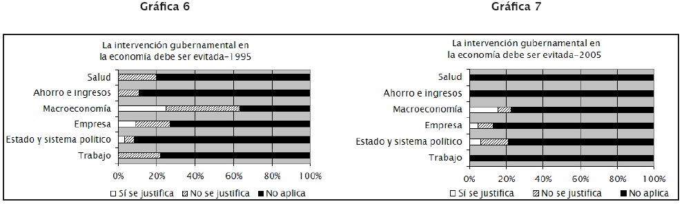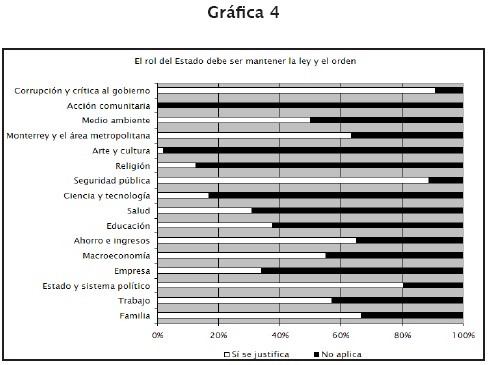 Como se observa en la gráfica 4, es llamativa la justificación que se otorga al Estado en su participación como garante de las relaciones humanas, no solamente en ámbitos vinculados al sistema político sino también en esferas de la vida social.