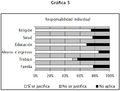 Por un lado, en la esfera privada (véase gráfica 5), como es de esperar, los resultados que se presentan justifican ampliamente la responsabilidad individual en los ámbitos de la familia, la religión y la generación de ahorro e ingresos. Sin embargo, es llamativo observar los datos arrojados con respecto a cuestiones como la salud, la educación y el trabajo. Las mismas, que pueden ser asociadas con dimensiones de tipo colectivo -en el caso de Monterrey y su cobertura periodística por parte de El Norte- se encuadran también en el ámbito de la responsabilidad individual. De forma que, en este modelo localista, el Estado no debe participar en políticas redistributivas a través de su participación en temas como la educación y la salud. Un ejemplo, obtenido de la muestra y que se vincula con el tema de salud, resalta la importancia de que los individuos tomen conciencia del uso de fármacos. En una entrevista, el especialista en genética Howard Coleman comenta: